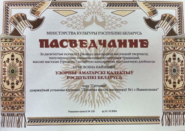 Министерством культуры Республики Беларусь на основании решения коллегии № 139 от 01.10.2024 выдано свидетельство о присвоении звания образцовый любительский коллектив Республики Беларусь хору «Світанне», художественный руководитель и дирижер Тофорова Светлана Владимировна, концертмейстер Кузьмина Ирина Васильевна, за достигнутые успехи в развитии любительского художественного творчества, популяризацию национальных культурных традиций, высокий художественный уровень и активную концертную деятельность.