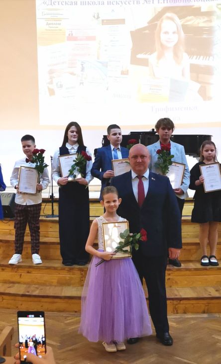 За творческие достижения 2024 года ученица нашей школы Трофименко Ева стала обладателем двух престижных премий: 7 июня Еве была вручена премия Новополоцкого городского Совета депутатов. 23 июня в Витебске на торжественной церемонии Ева получила премию Витебского областного Совета депутатов по поддержке талантливой молодёжи.